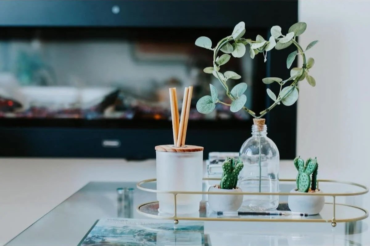 There’s a separate remote for the wall-mounted fireplace or you can operate this using the switches on top.